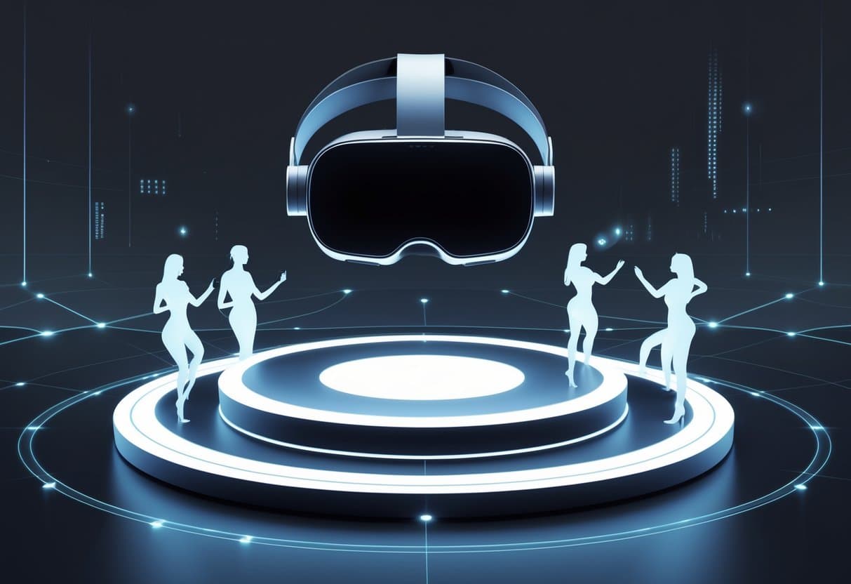 A futuristic virtual reality headset above a glowing circular platform with abstract human figures around it, representing immersive 360-degree adult entertainment.